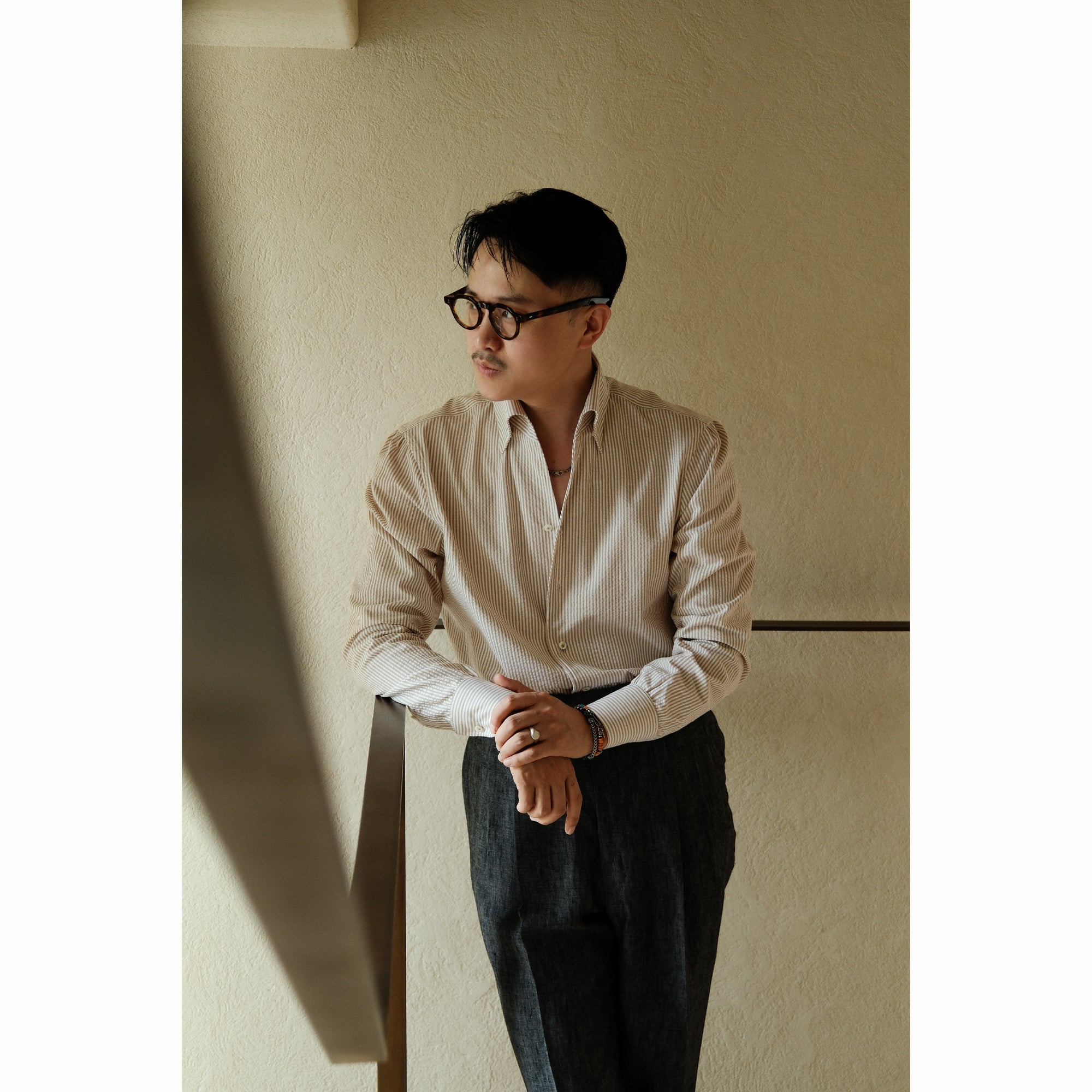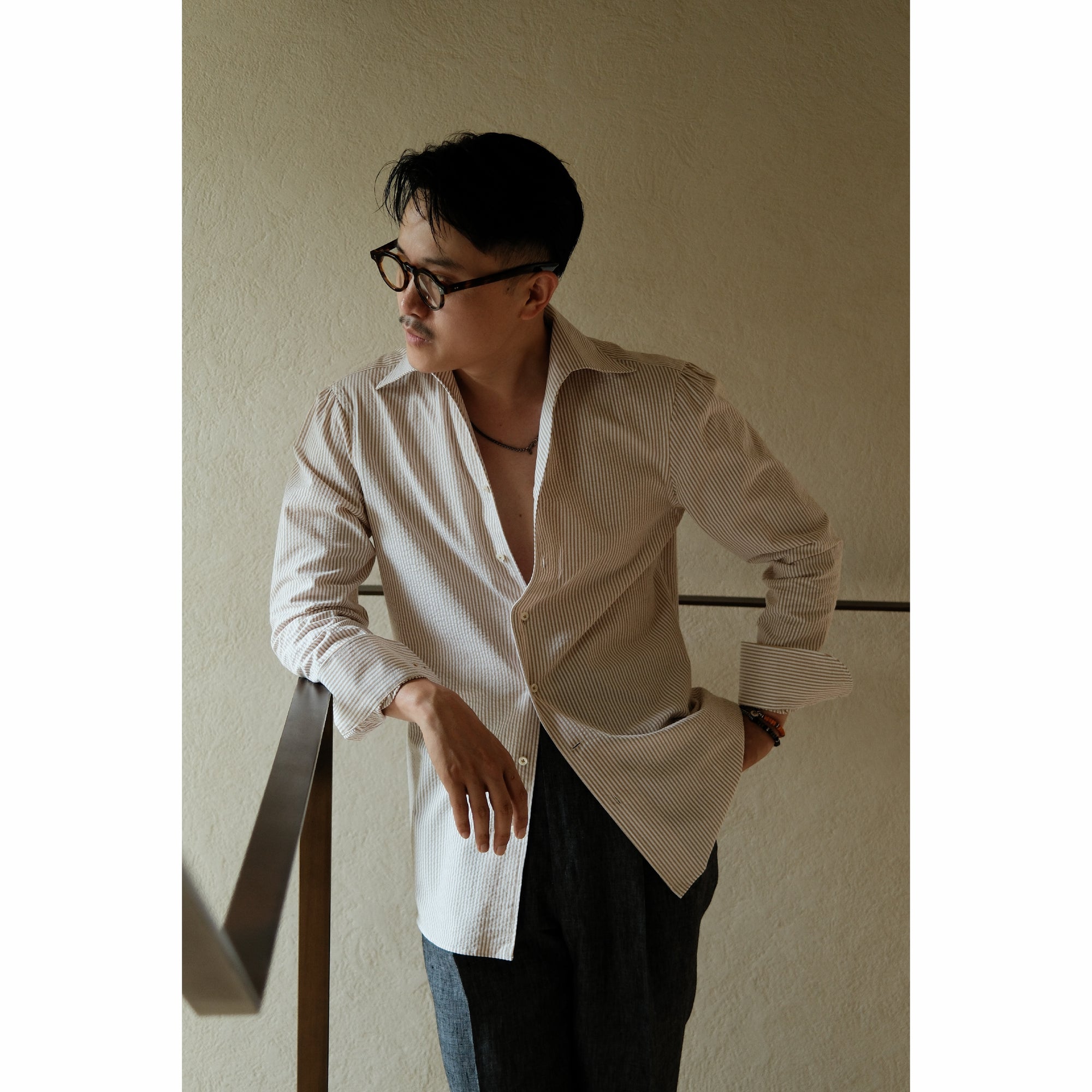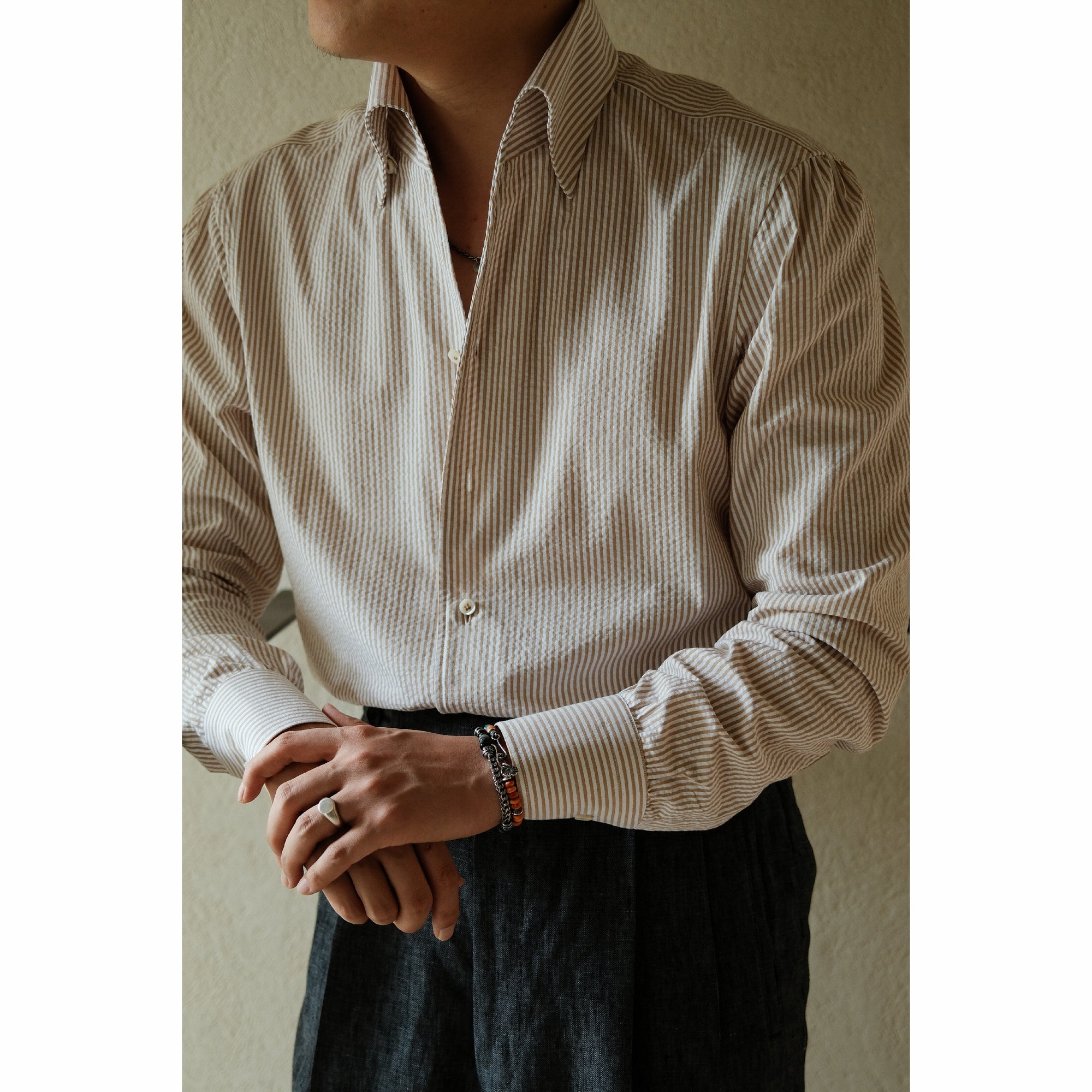 Ugentle One-piece Collar Shirt — Seersucker Beige Pencil Stripe