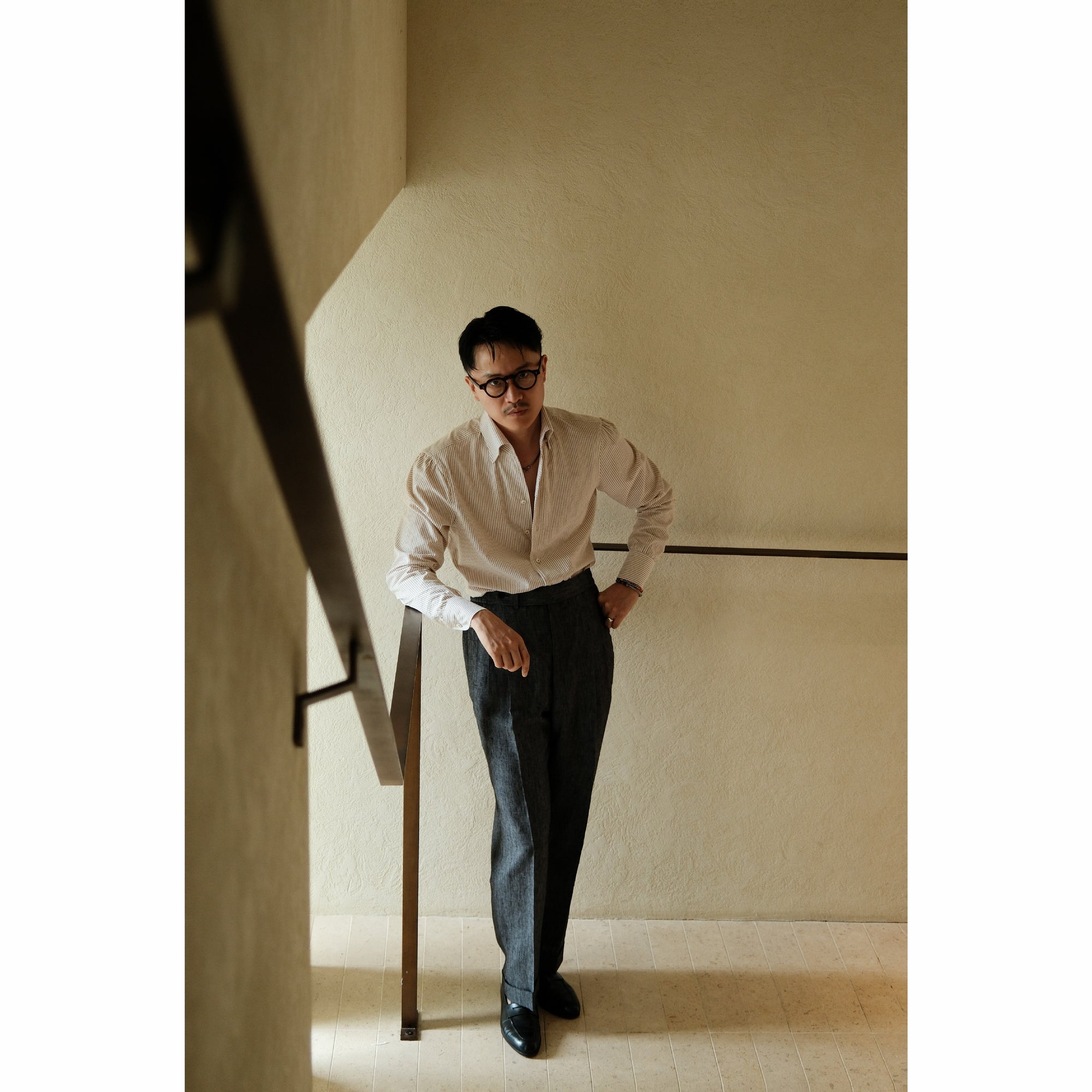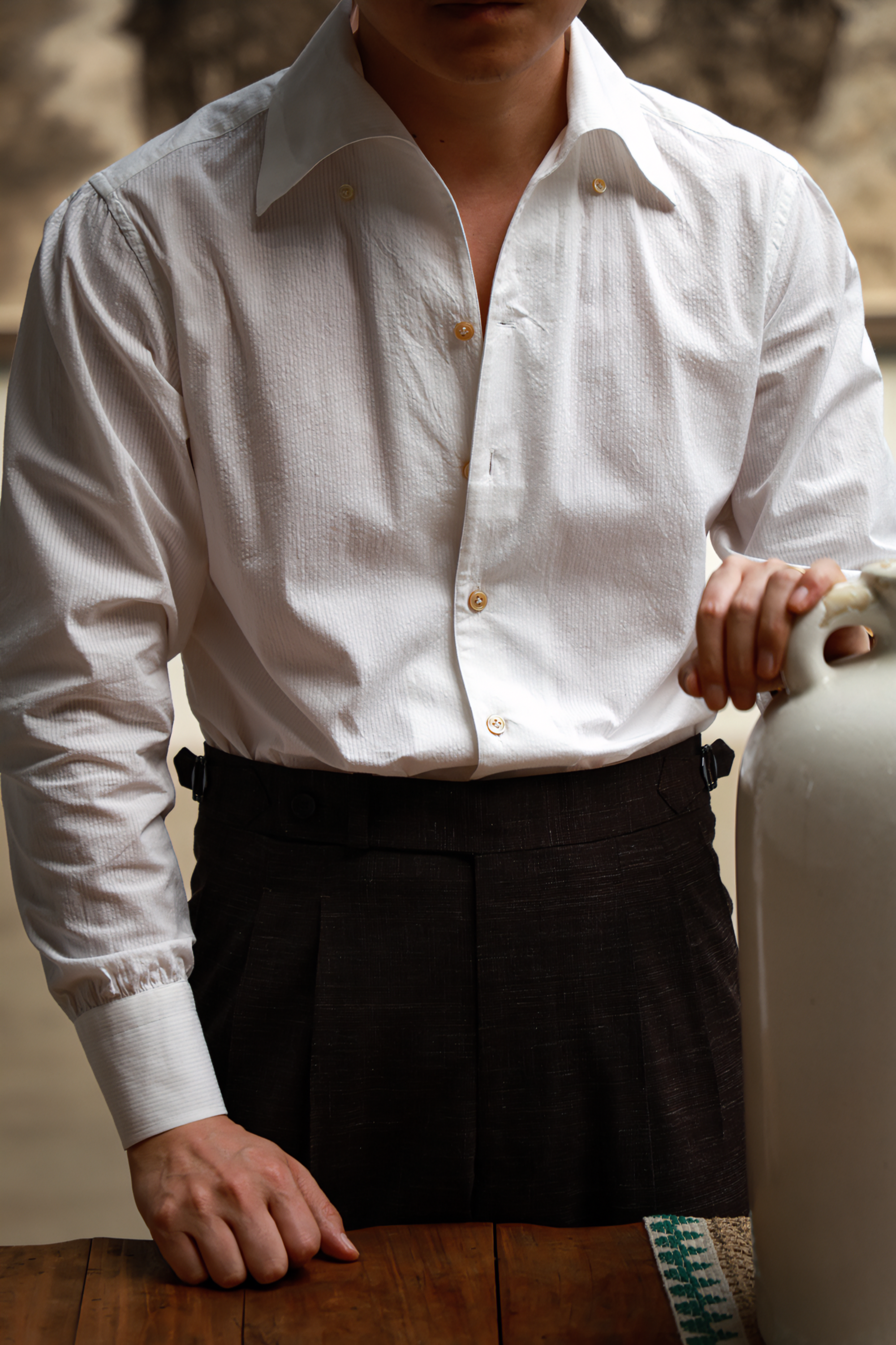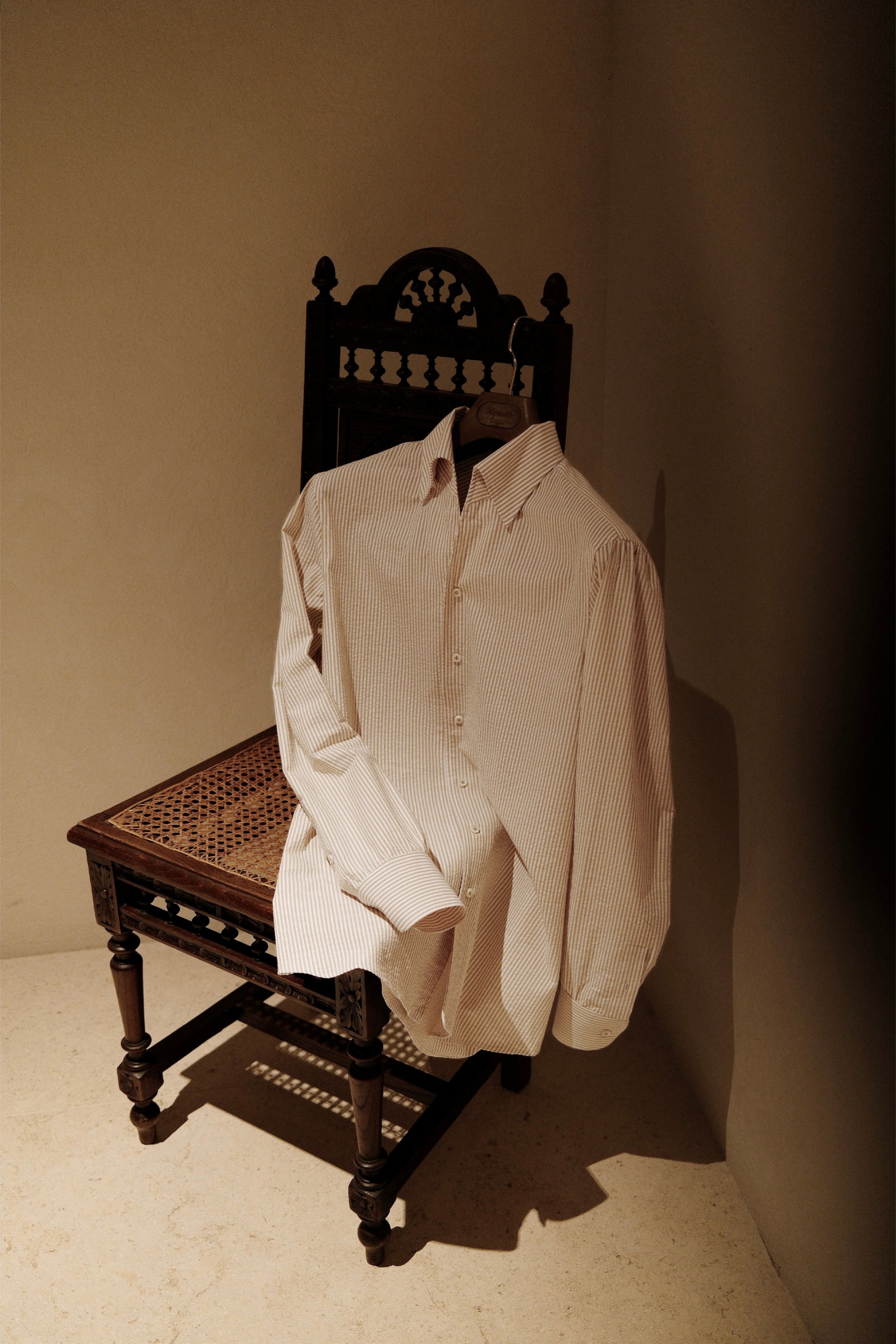Ugentle One-piece Collar Shirt — Seersucker Beige Pencil Stripe